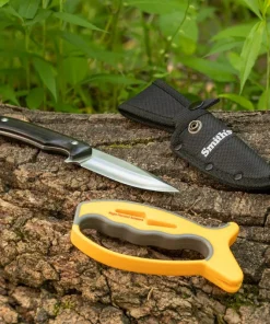 Smith’s EdgeSport 4″ fixed fixed blade great for skinning and rugged use has a black Pakka wood handle with lanyard hole and cordura sheath. The combo includes Smith’s V-Sharp pull-over knife and game shear sharpener