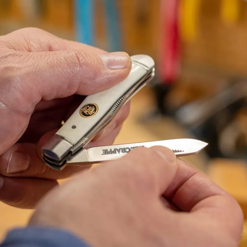 Smith’s Wally Marshall Mr. Crappie Trapper with Red Smooth Bone and Mother of Pearl and Abalone Inlay handles, numbered limited-edition, custom-designed by legendary crappie fisherman “Mr. Crappie” Wally Marshall, the Smith’s “Mr. Crappie” pocketknife can make a fantastic collector’s knife. With its sleek red smooth bone handle that is inlaid with mother of pearl and abalone, this pocketknife will stand out in any collection. Satin 420 stainless steel blades. Red smooth bone handles with mother of pearl and abalone inlays. Slip joint lock. Thumbnail nick. Brass pins and liners. Nickel silver bolsters and Mr. Crappie-shaped shield. 3-1/8″ clip point plain edge blade. 3-3/8″ Spey plain edge blade. 4.16″ closed. Store your limited-edition, Mr. Crappie Trapper, in the custom collector box.