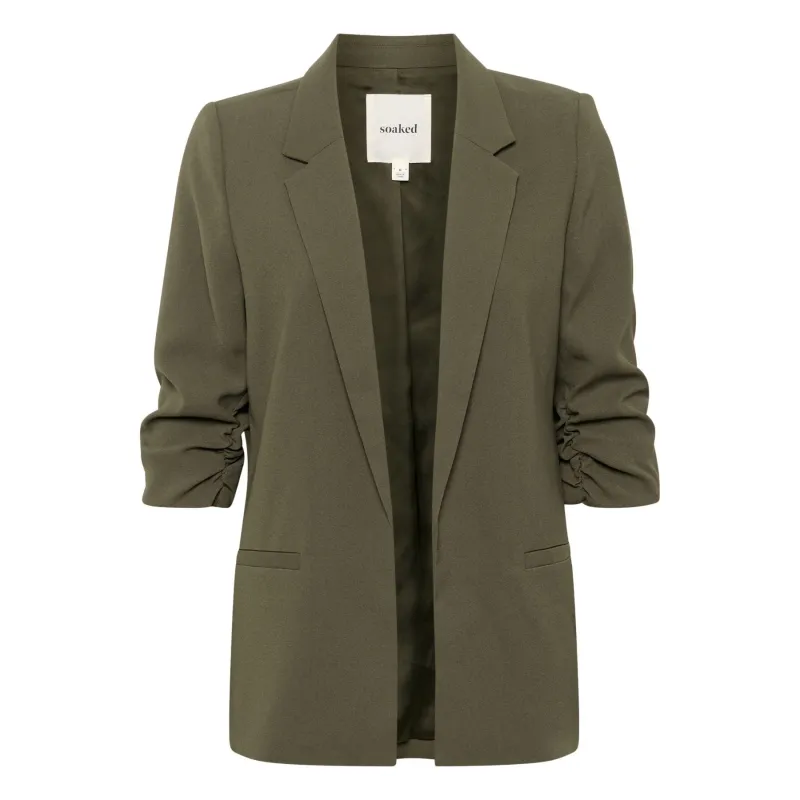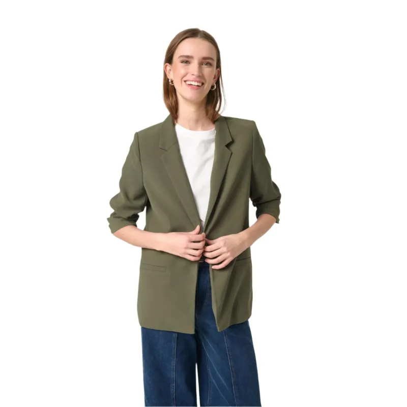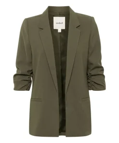 A chic stone Blazer from Soaked In Luxury, comes in a regular fit with ruched ¾ length sleeves, side pockets, lapel and slit at the back. The Shirley blazer is great for a formal look. Designed in a low collar and pockets to the front.