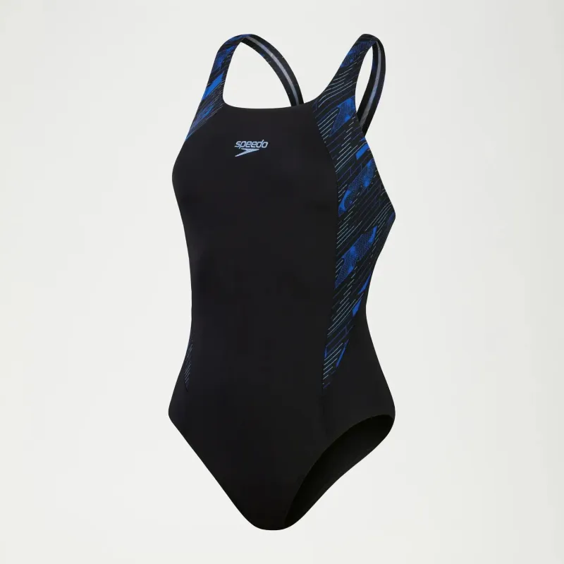 SPEEDO WOMENS HYPERBOOM SPLICE MUSCLEBACK 1 PIECE SWIMSUIT BLACK/BLUE