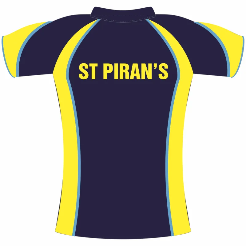 Boys reversible rugby jersey – Navy with Gold and Sky colouring outside – Gold with Navy and Sky inside. Both sides feature a printed St Piran’s School Logo and St Piran’s wording printed across the back in contrasting colours (Navy on Gold/Gold on Navy). Performance Polyester lightweight fabric.