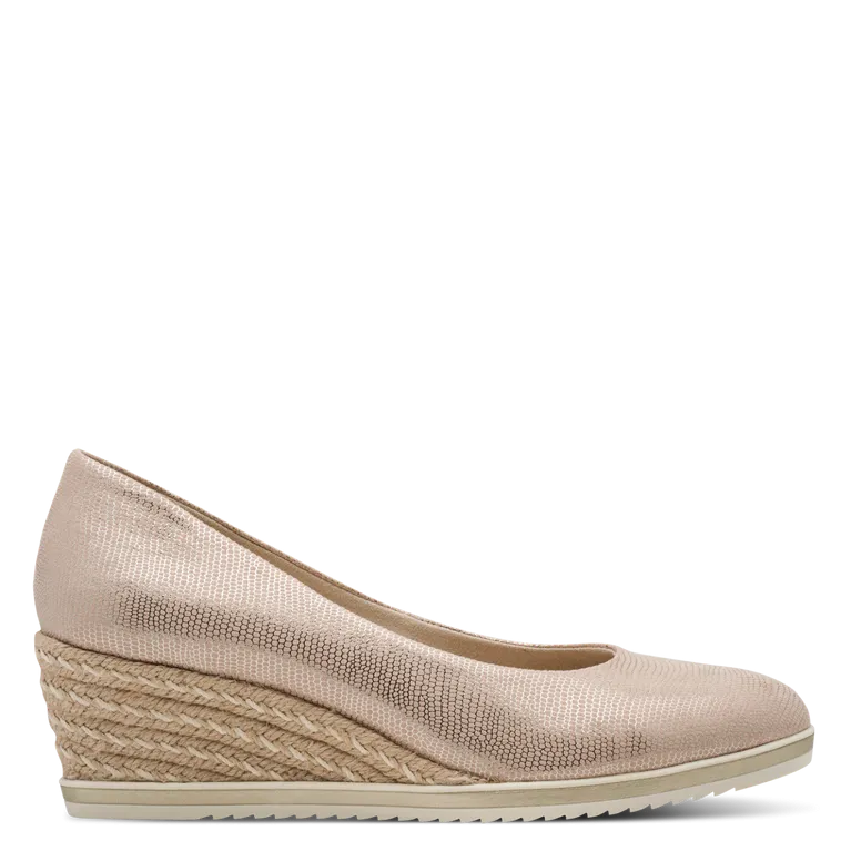 The Tamaris Women’s Shoe 22313 in Light Gold Struct blends effortless elegance with everyday comfort. Designed with a subtle textured metallic finish, this wedge heel adds a refined shimmer to both casual and dressier looks.