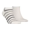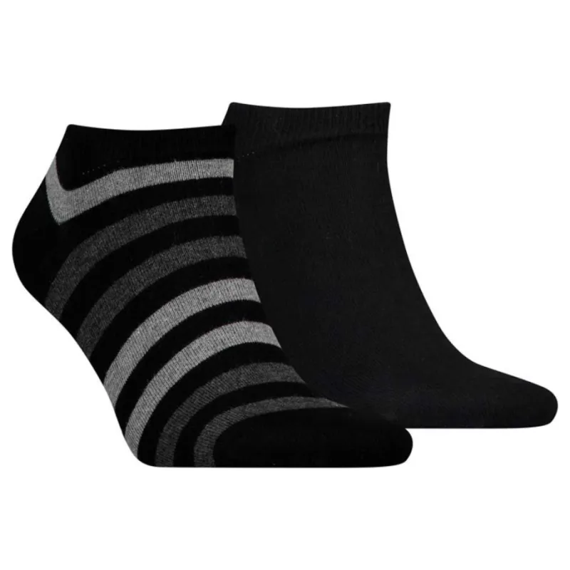 A stylish, comfortable and modern mens 2 pack ankle socks from Tommy Hilfiger. Featuring one pair in black with Tommy Hilfiger branding and the other pair in black with a duo stripe pattern in a mix of light grey and dark grey with Tommy Hilfiger branding.