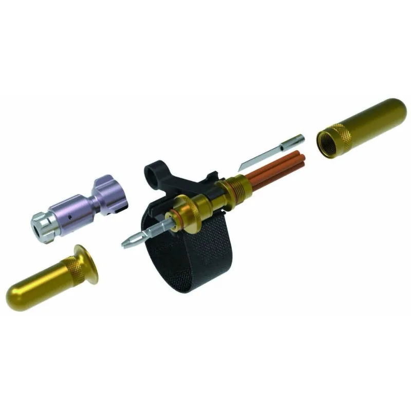 A complete tubeless tyre repair / CO2 inflation kit. Contents consist of tubeless repair tools with four tyre plugs stored inside a machined pod, and a MicroAirBooster CO2 inflator head secured to a mounting module that can be strapped to a frame tube or seatpost.