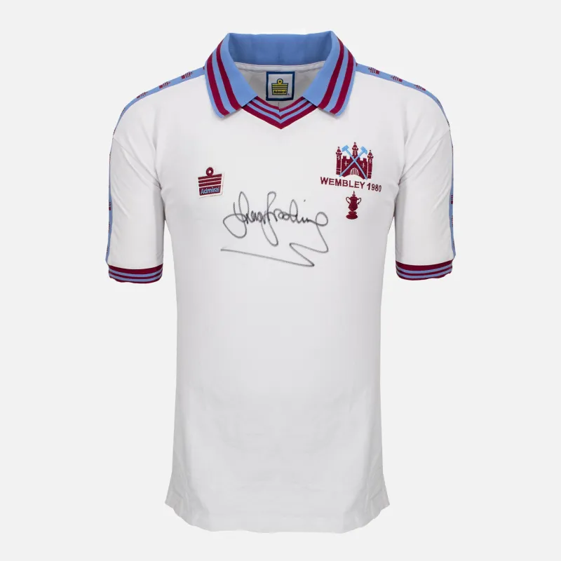 Trevor Brooking personally signed away West Ham United football shirt. As worn in the famous 1980 FA Cup Final with match detail. Re-issue Admrial shirt, Brooking scored the only goal of the game to win the cup.