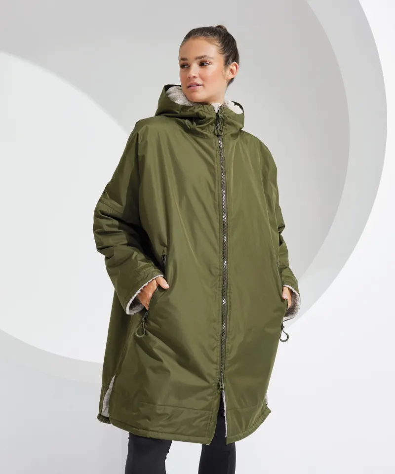 TriDri’s latest outerwear is essential in everyone’s wardrobe! The TriDri® All-seasons waterproof changing robe boasts a waterproof exterior with hood to keep you dry, as well as adjustable straps to the wrists and chin guard to help lock in heat on windy days. The cosy sherpa fleece interior absorbs moisture and keeps you warm, making it a great choice after water activities or rainy days on the football pitch. Designed to be oversized, the jacket is ideal for changing into warm, dry clothes, offering a double zip – so more room to move! Featuring multiple deep pockets, inside and out, it’s not just for athletes, but perfect for rainy commutes or frosty walks with the dog.