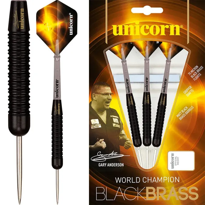 Gary Anderson Unicorn Black Brass Darts. All Unicorn World Champion Black Brass Darts feature: Matt Black Brass Barrels, Engraved Unicorn hallmark of quality, Gripper Shafts, Unicorn Flights. Unicorn WC Black Brass – Steel Tip – GA1 – Gary Anderson – Black