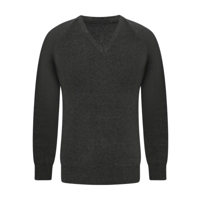 V-neck sweater – grey. 100% low pill, acrylic yarn, ultra soft handle and comfortable fitting.