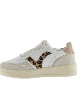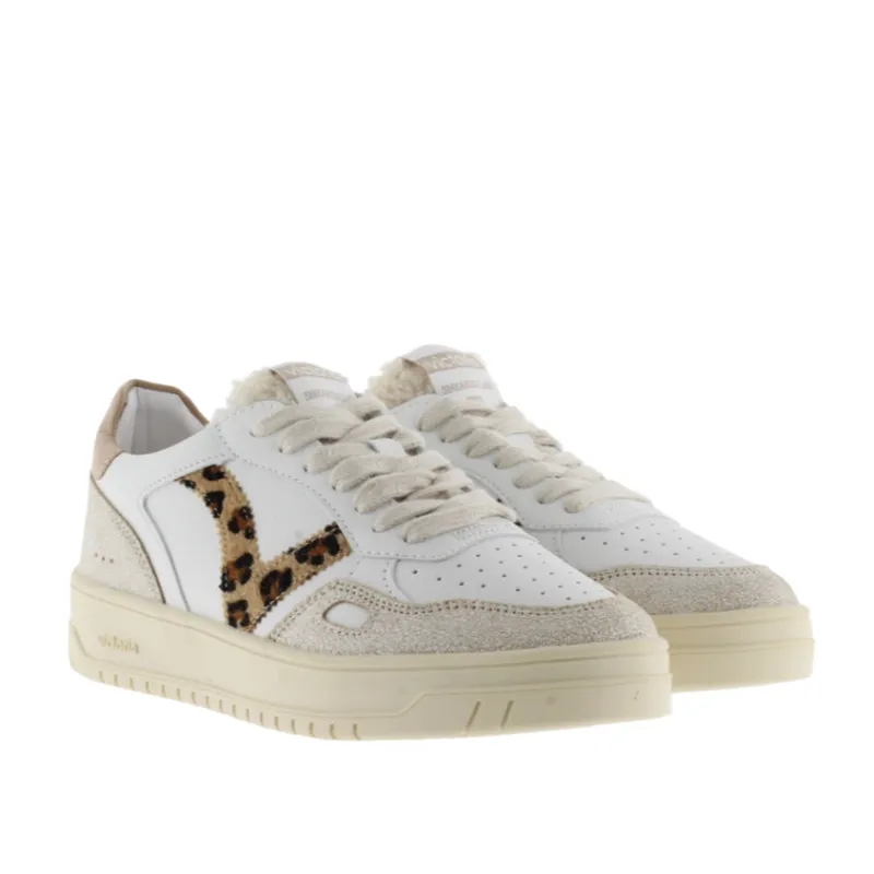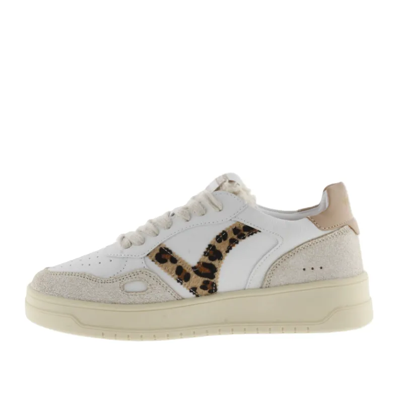 The Victoria Womens Trainer 1257124 Camel brings together a retro court-style silhouette with bold modern accents. Crafted in smooth white leather with textured suede overlays, this trainer stands out with its leopard-print “V” side logo, adding a touch of wild flair. The neutral tones ensure easy styling, while the cushioned sole delivers all-day comfort.