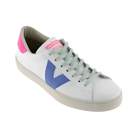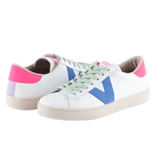 Add some pops of colour to your footwear in the Berlin trainer from Victoria. In a fresh white leather featuring a neon pink pop to the heel, green laces and blue suede v to the side. Textile lined