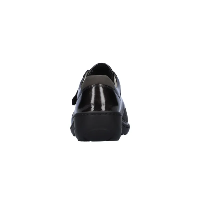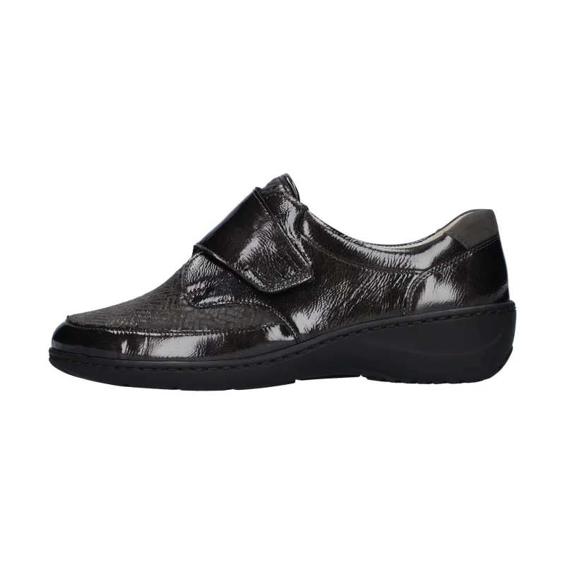 A comfy casual ladies wide fitting shoe from Waldlaufer featuring dark grey leather and textile uppers with a print of the toe and vamp. Fastened with a super easy velcro strap across the foot, textile lined with a cushioned and removable leather footbed.