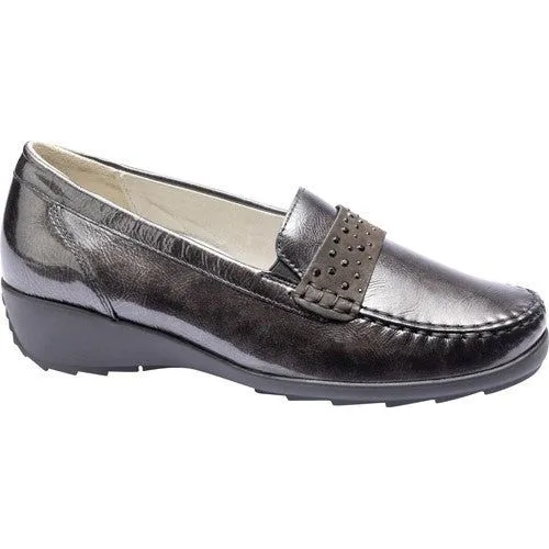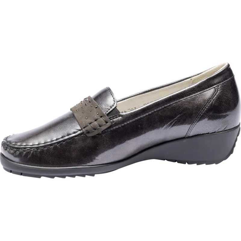 Slip into comfort with the ladies Hanin Shoe from Waldlaufer for her. In a high quality dark grey patent leather with a comfortable removable insole, perfect for your custom insoles. Leather lining with a 15mm moulded heel. In a wide fitting