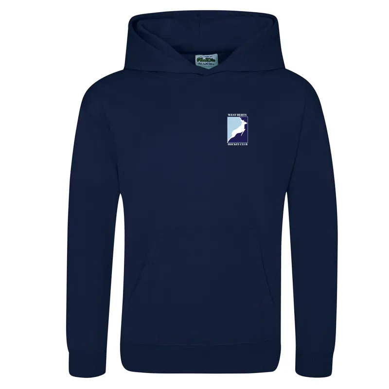 West Herts HC Junior Hoodie in navy with club logo printed on left breast and WEST HERTS HC printed on back in white