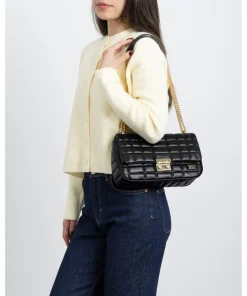 Elevate your look with this sleek black quilted shoulder bag from XTI. With a structured silhouette and plush stitching detail, it channels timeless elegance while offering everyday practicality. A luxe gold-tone turn-lock clasp and chain strap add a touch of glamour, making it ideal for dinner dates or stylish daywear.